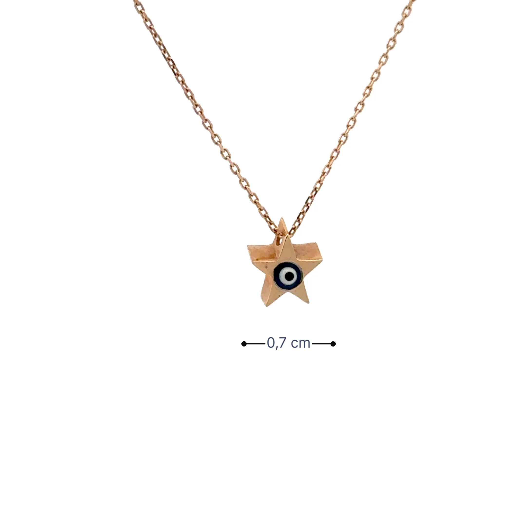 Tasarım Detayı: Yıldız formunun tam merkezinde yer alan göz motifi, kolyeye mistik bir anlam katar. Göz detayının iç kısmında yer alan minik taş veya mine dolgusu, parıltılı ve dikkat çekici bir merkez oluşturur. 45 cm uzunluğundaki zinciriyle zarif ve dengeli bir görünüm sunar.