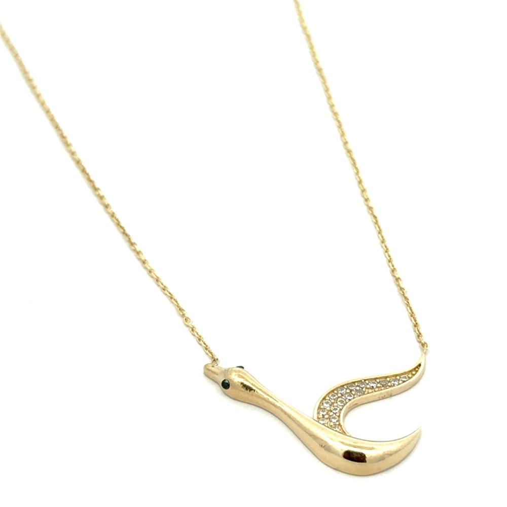 Zarif ve Anlamlı Bir Tasarım: Turna Kuşu 14 Ayar Altın Kolye, doğanın zarafetini ve özgürlüğünü temsil eden turna kuşunu estetik bir şekilde tasvir eder. Bu kolye, hem şıklığı hem de anlamı ile her anınıza zarif bir dokunuş katar.