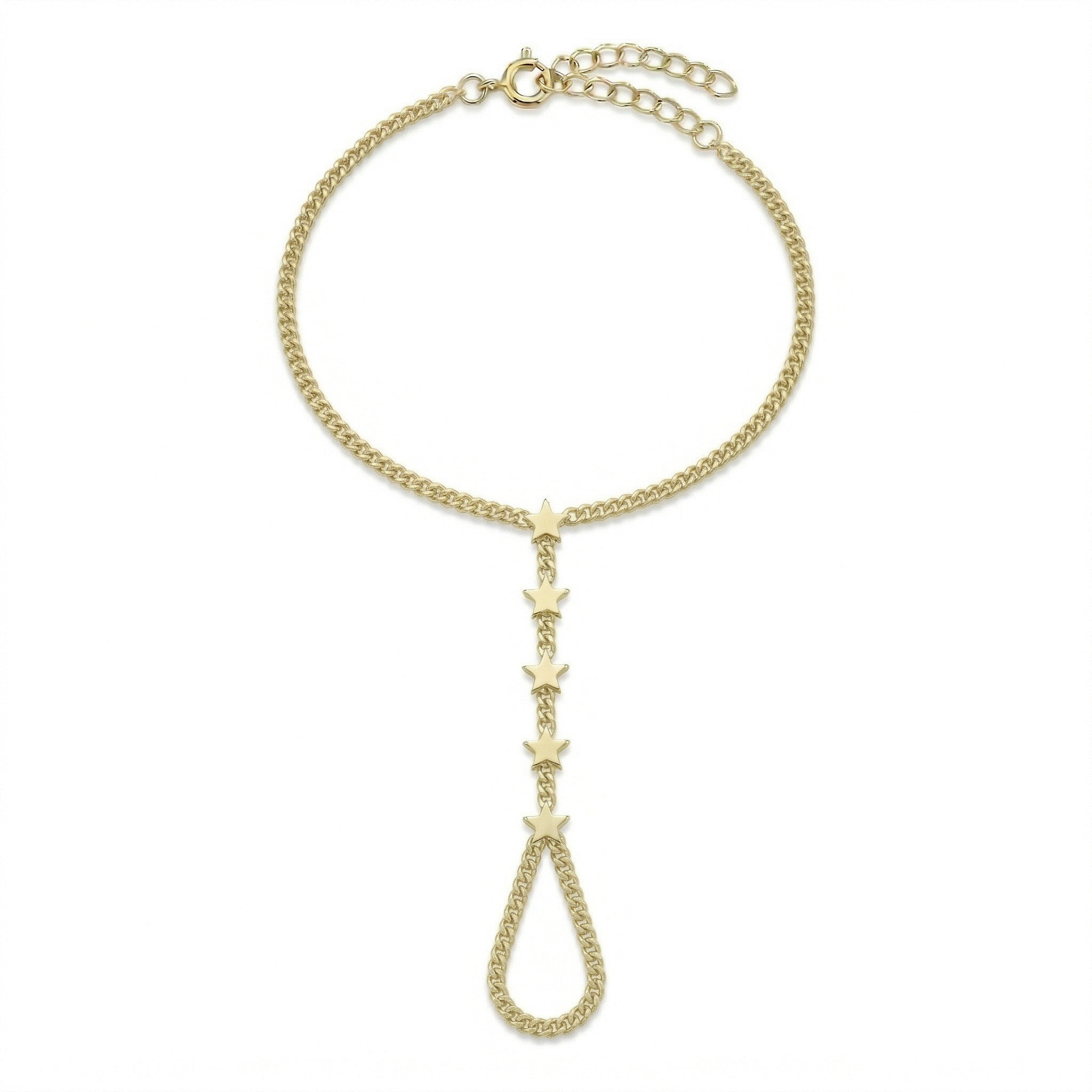 Yıldızların Büyülü Dizilişi Yıldız Yolu Şahmeran, gökyüzünün ışıltılı yıldızlarını zarif bir akışla ellerinize taşıyor. Bilekten parmağa doğru süzülen ince altın zincir üzerinde art arda sıralanan minimal yıldız figürleri, 14 ayar altının sıcak dokunuşuyla birleşerek hem modern hem de masalsı bir görünüm sunar.